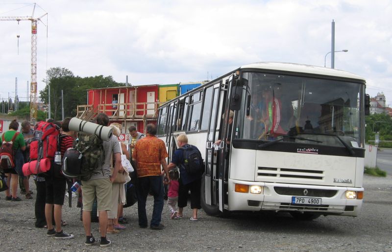 Konečně přijel autobus, ale pozor, nezastavuje před označníkem zastávky před hostincem. Řidič na mě volá: „Tam nikdy nezajíždím, nedá se tam otočit!“ V autobusu sedí pouze jedna cestující, další dvě děti přistupují až ve Stebně. Řidič praví: „Sem do Stebna původně (než Ústecký kraj zrušil vlaky) autobus nemohl kvůli výšce železničního viaduktu vůbec jezdit, pak to zvedli (hm, aby mohli zrušit vlaky, dodávám..).“