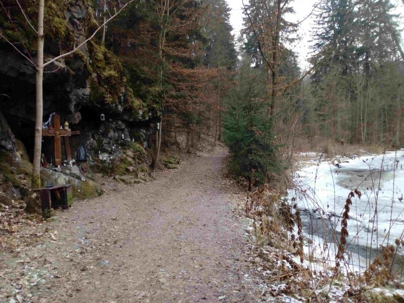 Tentokrát zvu do Mokrovrat, ze zastávky PID busu 688 Mokrovraty u statku pokračujme doprava k bystřině Kocába, podél ní dojdeme k málo známému poutnímu místu V Lurdech. Jeskyně u Kocáby evokuje jeskyni v miniatuře francouzského poutního místa Lurdy. Podél Kocáby možno pokračovat do hornického města Nového Knína (bývalý pivovar rekonstruován v roce 1911 firmou Schifauer, později sloužil firmě Elko) a dále dle uvážení putujícího až k trati Vrané - Dobříš. U Nového Knína se kdysi těžilo zlato, stejně tak jako u Jílového u Prahy. Muzeum těžby zlata v Novém Kníně je bohužel v zimním čase mimo provoz.